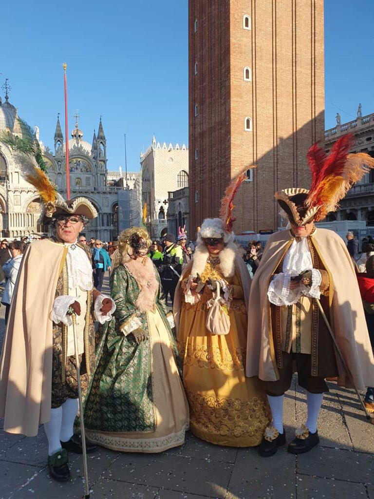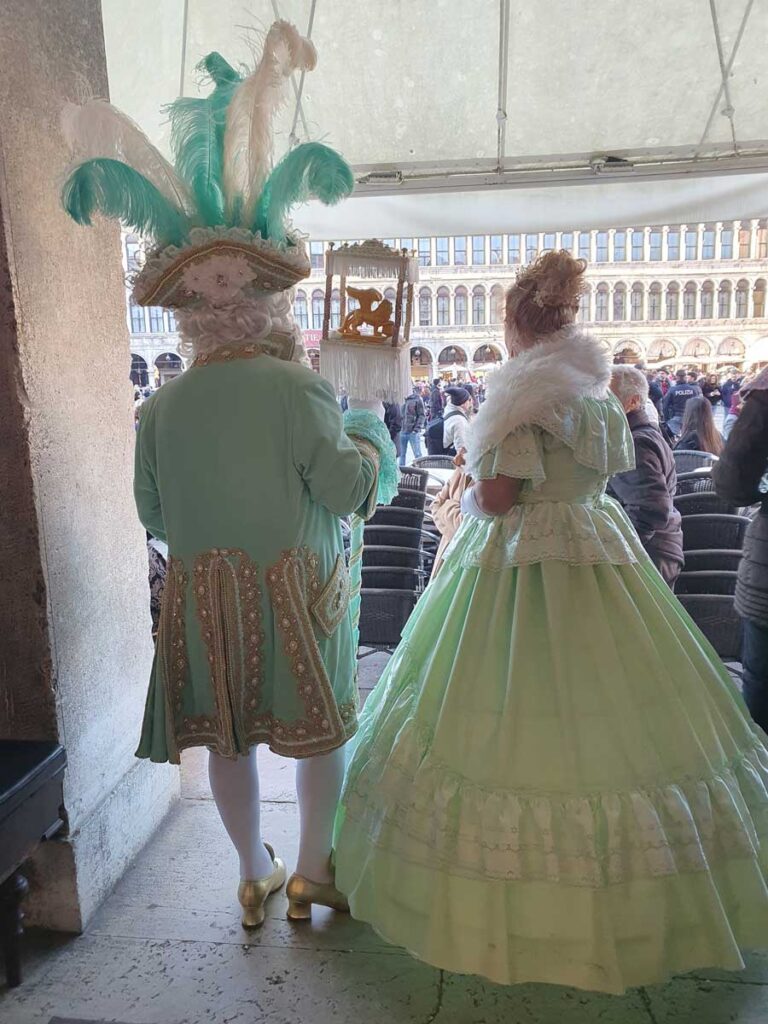 These glamorous costumed companions were hard to photograph unobstructed, as they were surrounded by admirers in modern puffy coats and winterwear. But I was lucky enough to snap this angle with no-one else in the way, including a nice glimpse of the portico by Caffè Florian and the evening sky. Gorgeous colours and lighting, and it feels like these extravagantly-dressed dandies are really living their roles and sharing old-time Venetian scandalous gossip.
